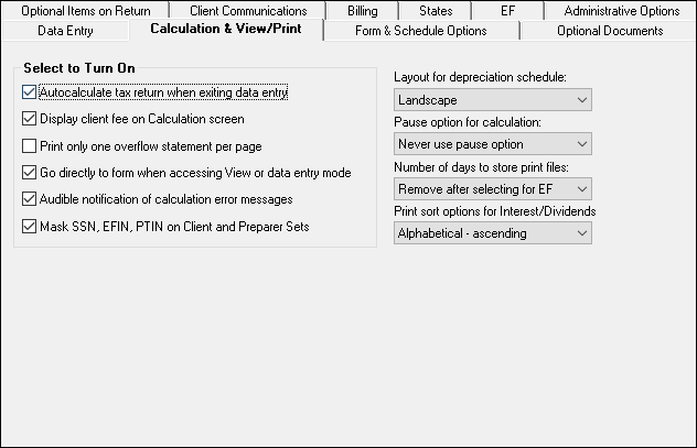 Select to store print files from 1 to 9 days, or to have them removed once the return is selected for e-file. If a return is needed after the print file is removed, recalculate the return to re-create the print file.