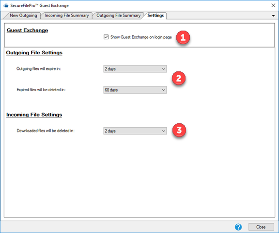 There are four tabs on the SecureFilePro Guest Exchange window.